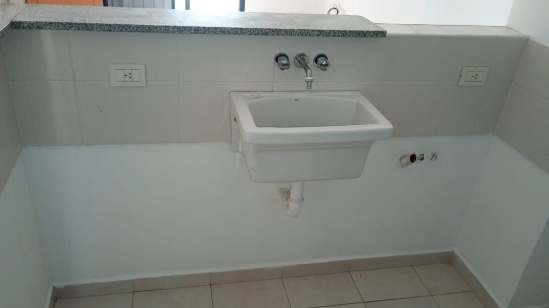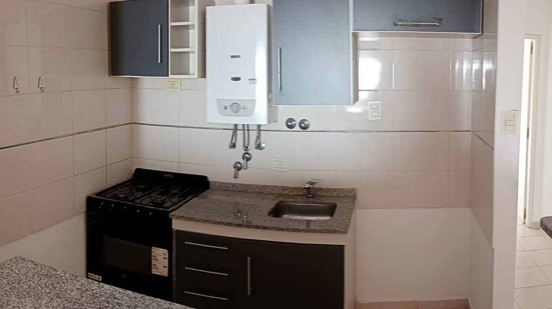 La cocina, integrada mediante una práctica barra desayunadora, se encuentra totalmente equipada con amoblamiento bajo mesada y alacena, artefacto de cocina y calefón instalados y en funcionamiento. Además, cuenta con espacio previsto para heladera y lavarropas.